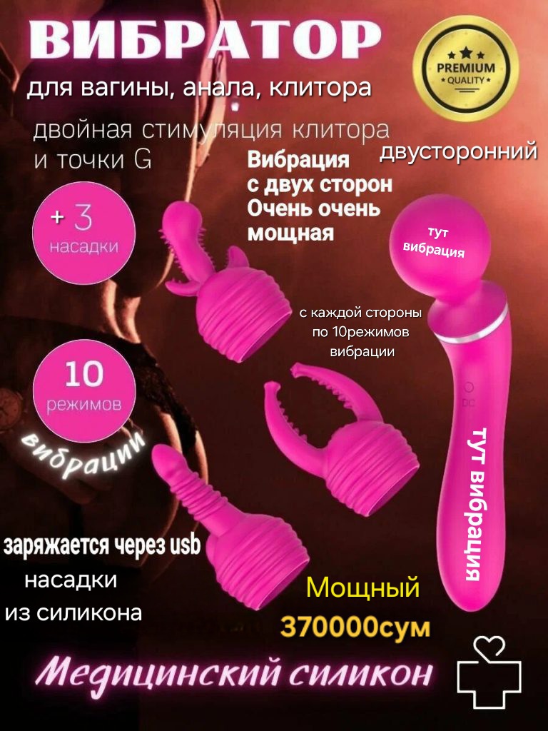 Вибратор двусторонний с тремя насадками в комплекте МОЩНЫЙ