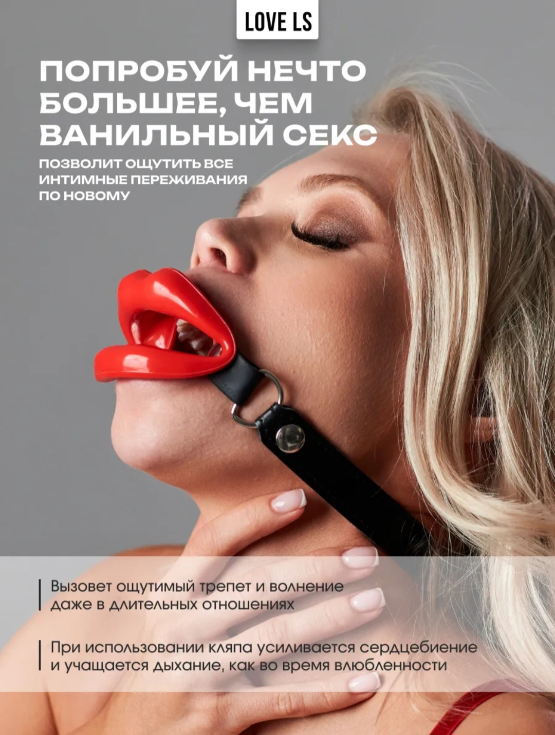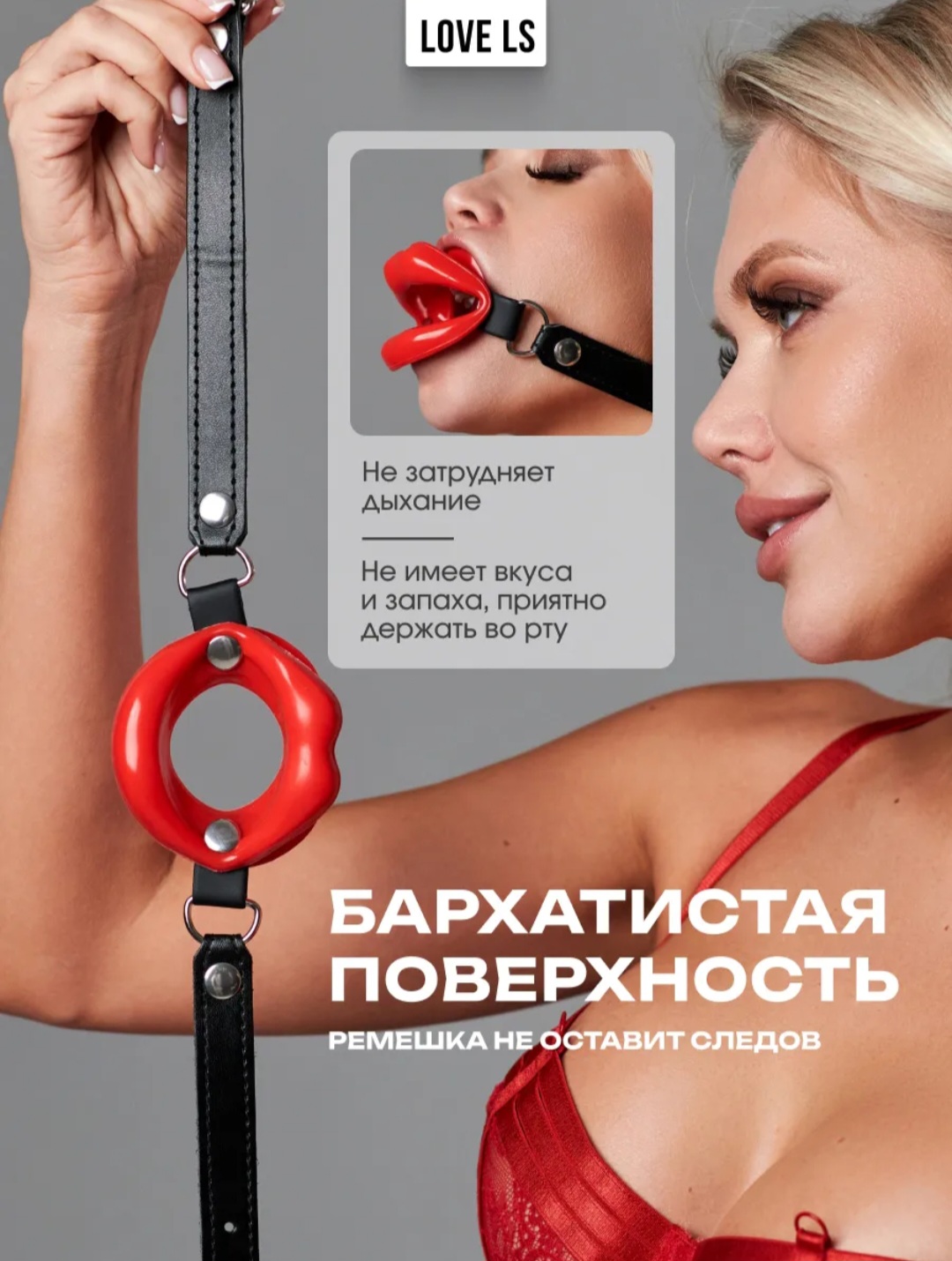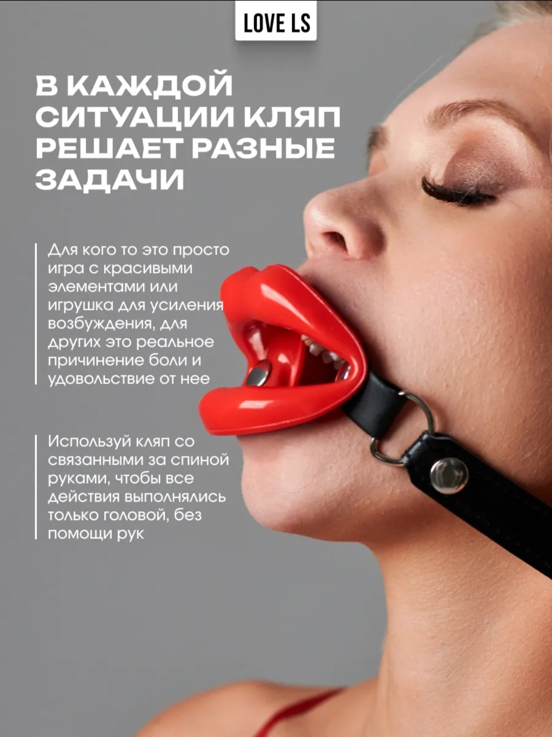 Помимо эстетики, этот кляп так же позволит наслаждаться и игривым язычком партнёра через отверстие между силиконовыми губами аксессуара.