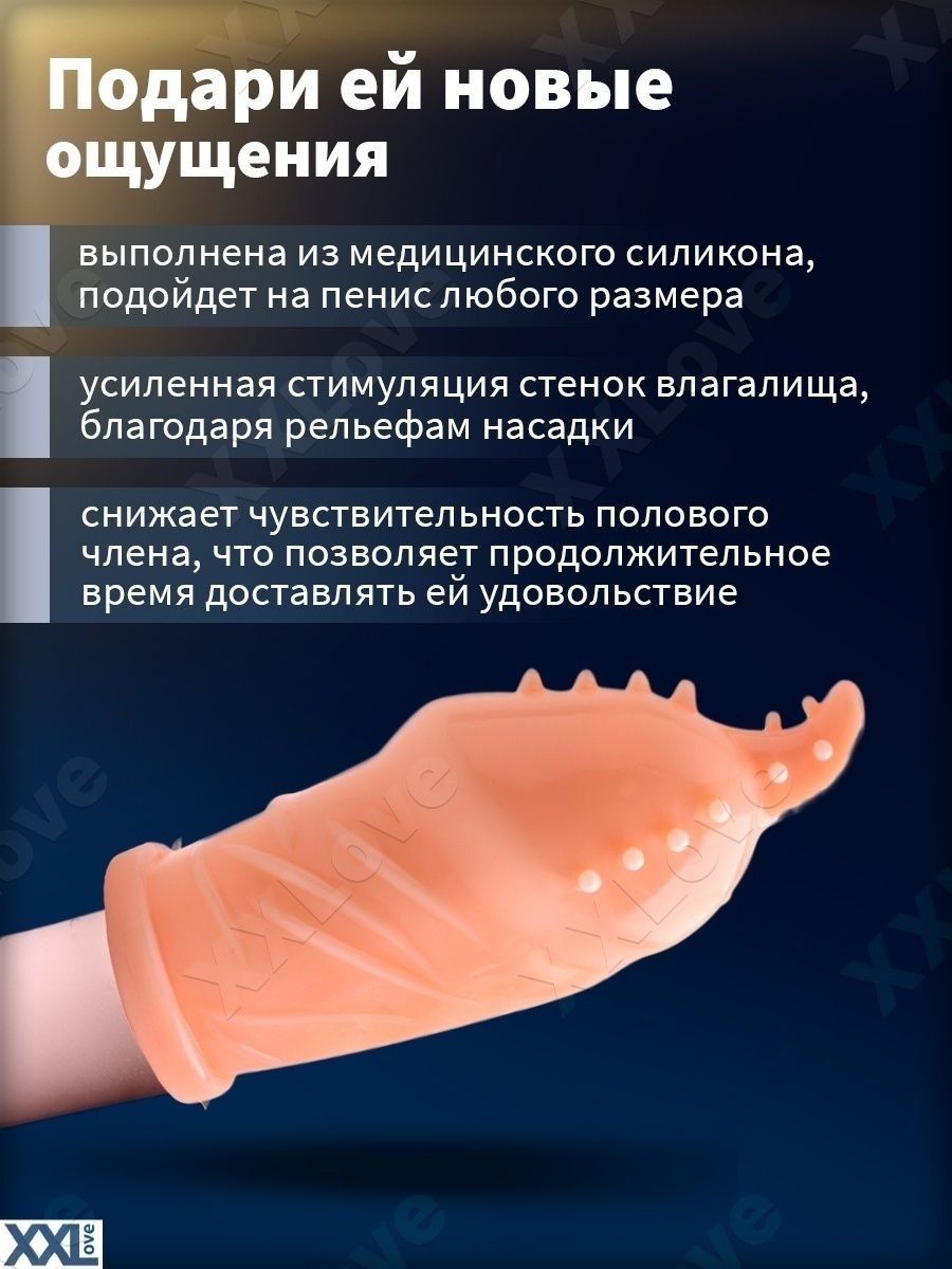 Рельефная насадка на член — это отличный способ разнообразить секс и усилить чувствительность во время полового акта. Благодаря индивидуальной рельефной поверхности каждой насадки создается дополнительная стимуляция точки G. Мягкие пупырышки, ребрышки, усики доставят приятные ощущения при проникновении и доведут женщину до легкой тряски при наступлении оргазма. Насадки изготовлены из медицинского гипоаллергенного материала, который очень эластичен и подходит для любого размера члена. Сухая и чистая кожа обеспечит надежную фиксацию секс игрушки. Для лучшего эффекта и вашей безопасности рекомендуем использовать наши товары для взрослых с лубрикантами на водной основе. Доставка анонимная. Желаем вам новых приятных ощущений!