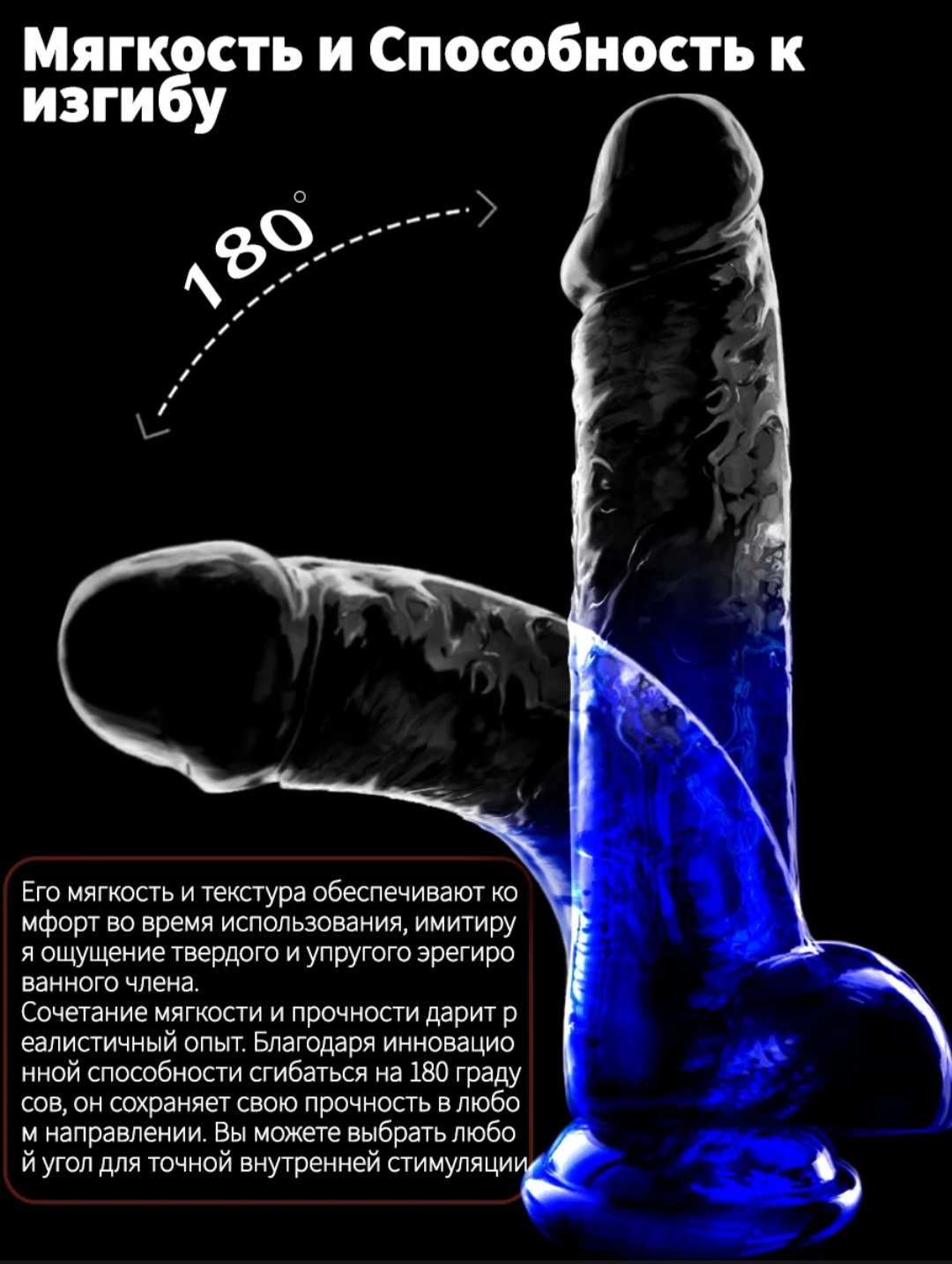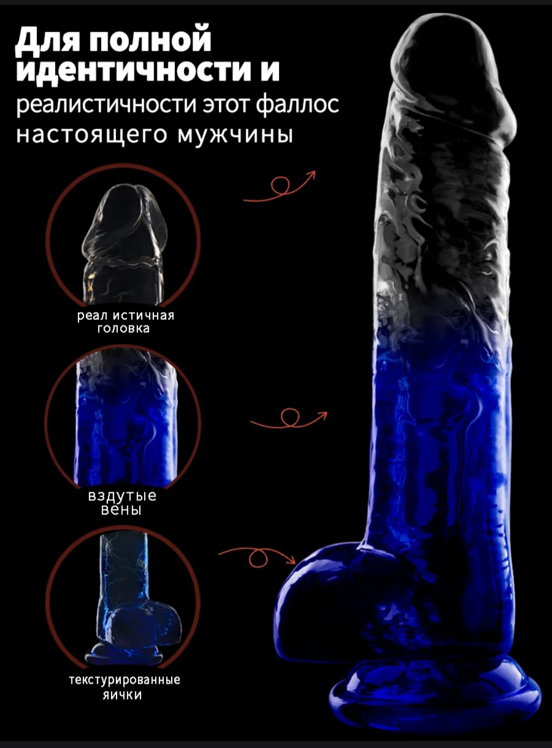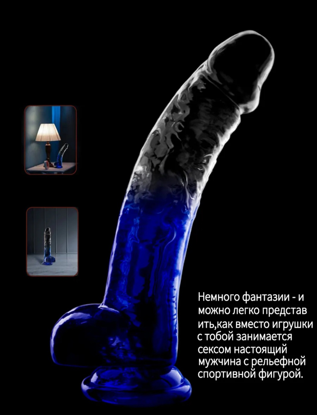Фаллоимитатор прозрачный на присоске с мошонкой наполовину синий