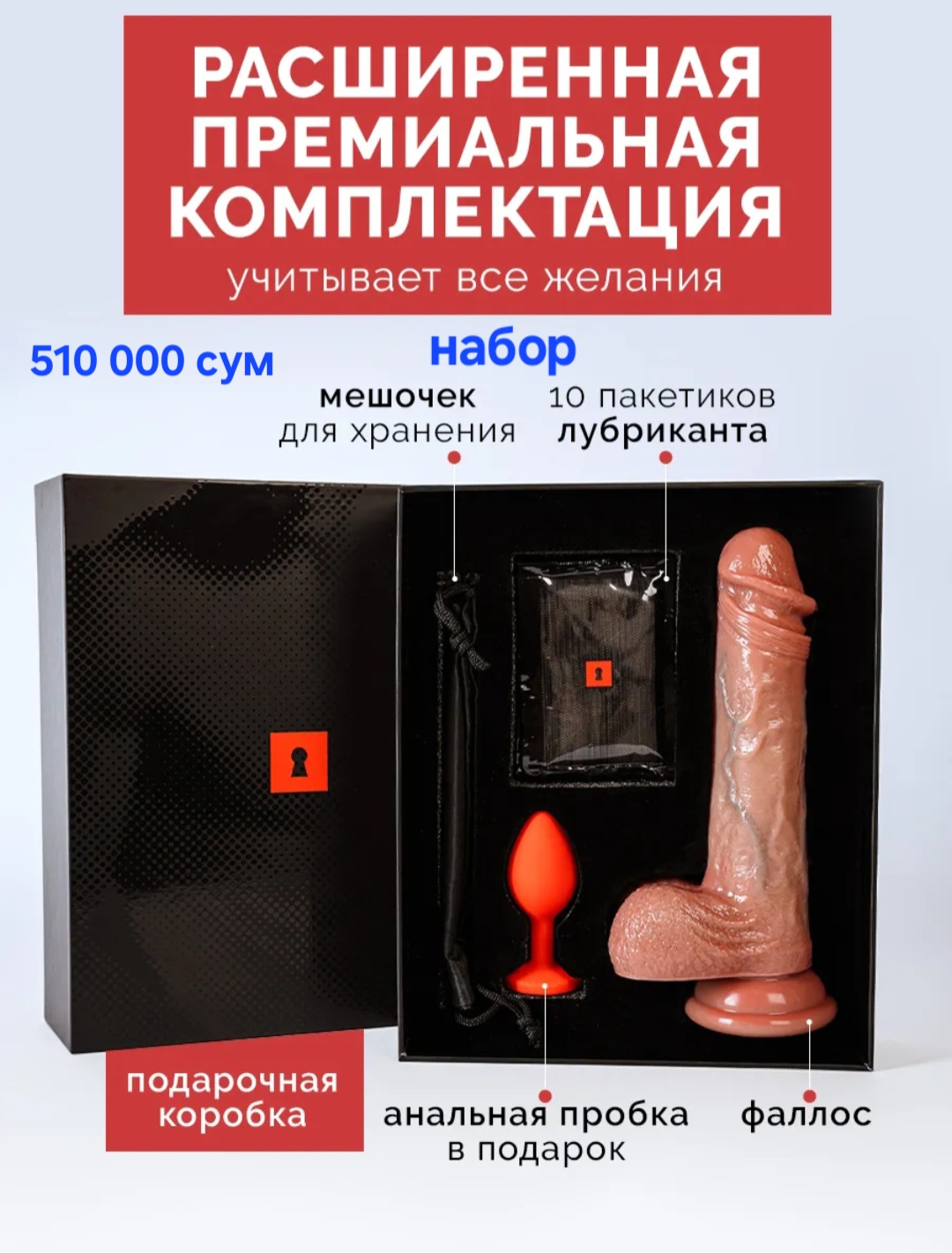 Набор Фаллоимитатор + пробка + смазка10штук(пробник по 10мл) + мешок для хранения